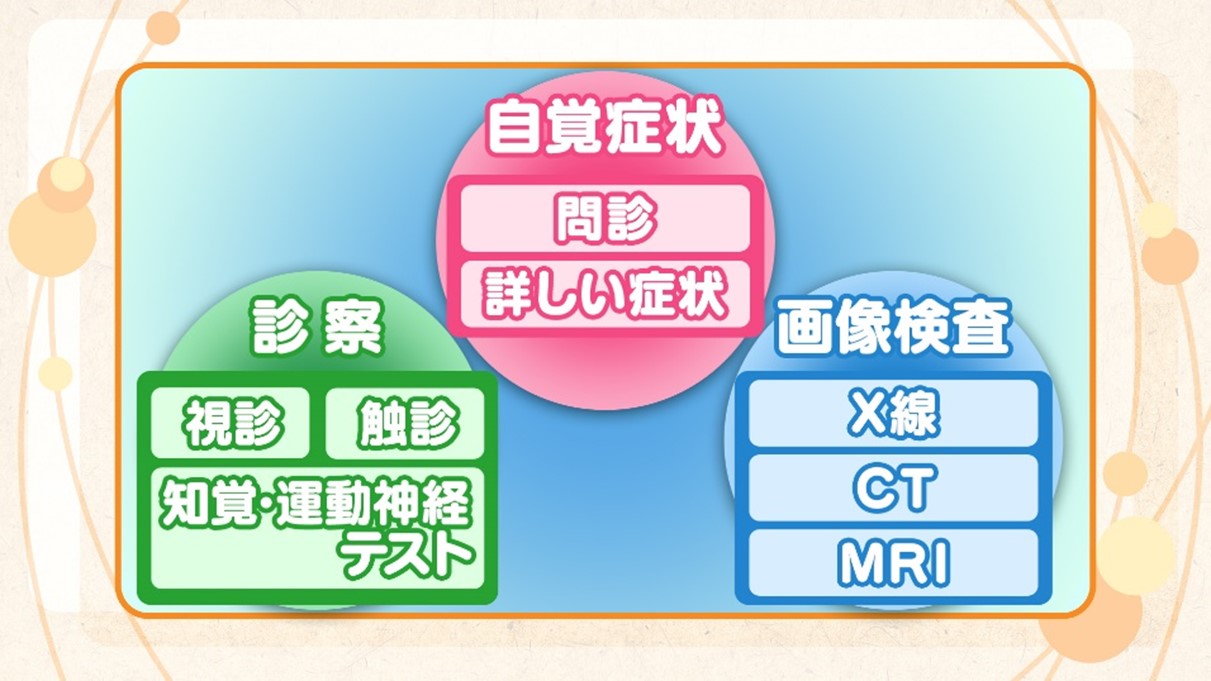 以上のような症状が生じると、日常生活にも大きな影響を及ぼします。診断は、主に患者様の訴え(自覚症状)、診察(他覚所見)、検査の3つによりなされます(図)。
